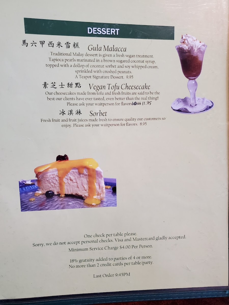 Traditional Malay dessert is given a fresh vegan treatment.Tapioca pearls marinated in a brown sugared coconut syrup, topped with a dollop of coconut sorbet and soy whipped cream, sprinkled with crushed peanuts.A Teapot Signature Dessert.