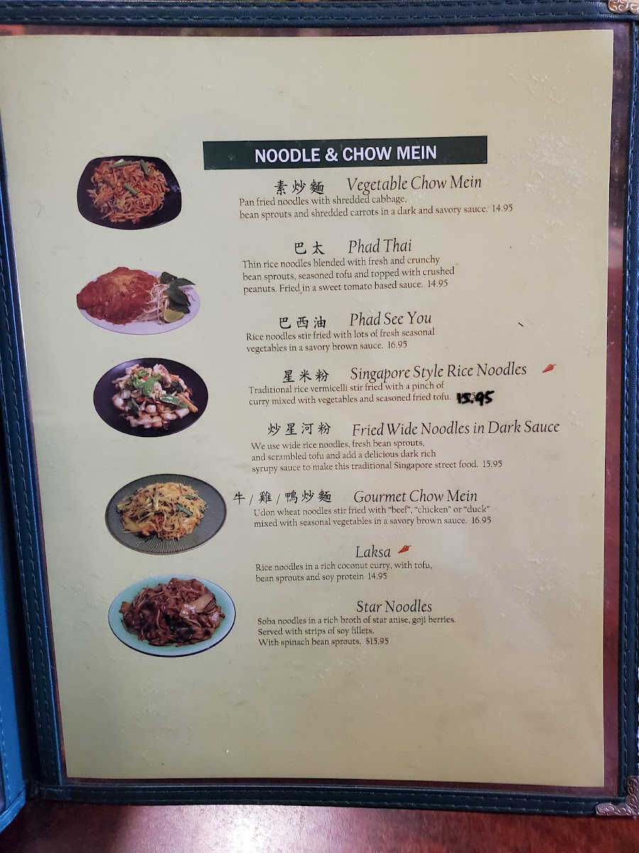 It is seasoned tofu stir fried in a sweet and spicy sauce with shallots over a bed of crispy rice noodles.