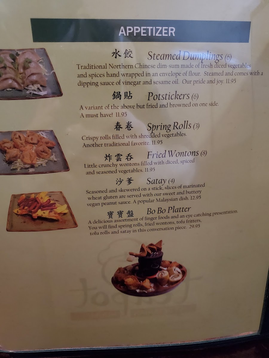 Traditional Northern Chinese dim-sum made of fresh diced vegetables and spices hand wrapped in an envelope of flour. Steamed and comes with a dipping sauce of vinegar and sesame oil. Our pride and joy.